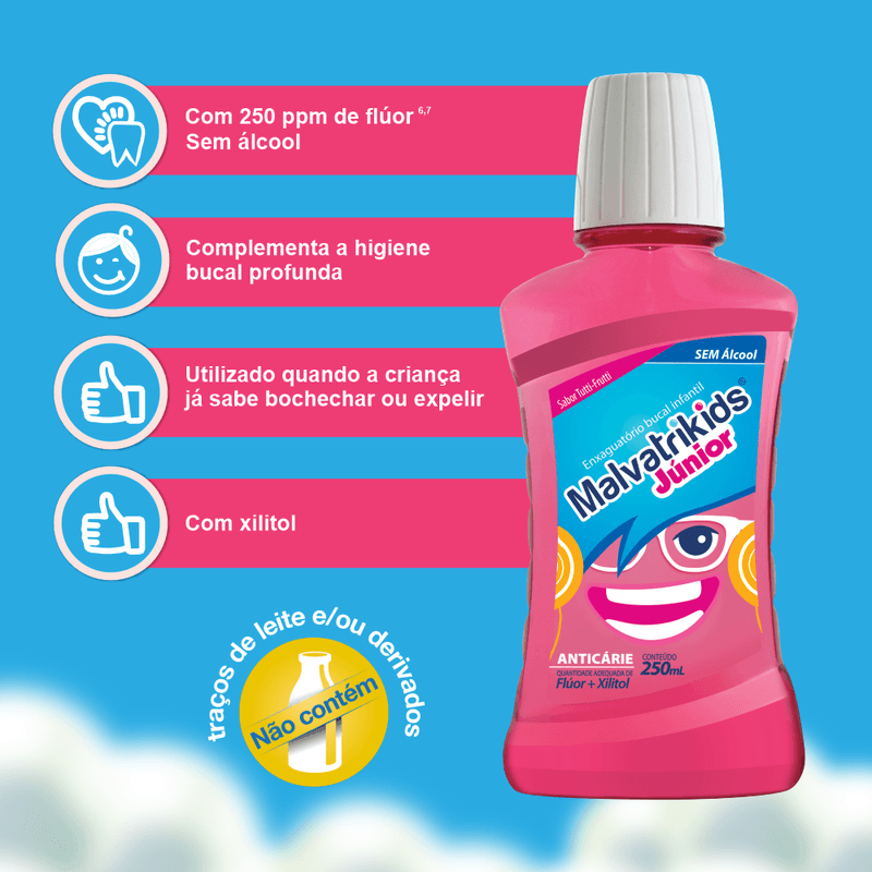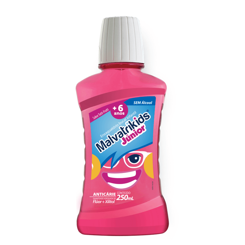 O Enxaguante Bucal Infantil Malvatrikids Júnior é uma solução desenvolvida especialmente para complementar a rotina de cuidados com a saúde dos dentes das crianças a partir de 6 anos. Manter uma rotina completa de higiene bucal desde a infância é fundamental para garantir um sorriso saudável no futuro, e este produto é um passo importante nesse processo. Sua fórmula avançada foi cuidadosamente elaborada sem álcool e sem corantes, combinando a ação do Flúor (em concentração de 226 ppm), que atua diretamente no fortalecimento do esmalte dental e na prevenção de cáries, com o Xilitol, um adoçante de origem natural que ajuda a inibir o crescimento das bactérias que formam a placa bacteriana. Este enxaguante bucal infantil alcança áreas da boca onde a escovação sozinha pode não ser suficiente, promovendo uma limpeza mais profunda e eficaz. Além de todos os benefícios de proteção, ele possui um delicioso e divertido sabor de tutti frutti, que incentiva a criança a adotar o hábito do bochecho diário, tornando o cuidado bucal um momento mais agradável e menos complicado.