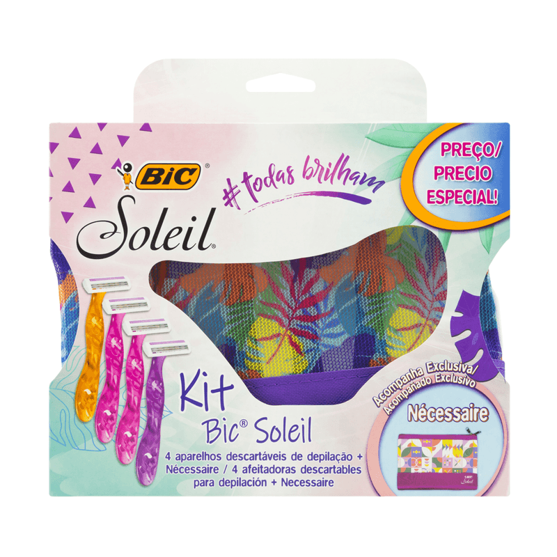 Conteúdo da embalagem: 4 aparelhos depilatórios descartáveis e 1 necessaire de brinde.